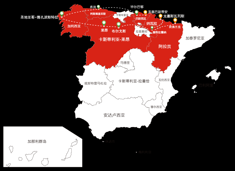 12世纪后,“圣雅各之路”成为欧洲最重要的朝圣路线,吸引了来自意大利、法国、德意志等地的信徒。怀揣着“圣雅各,我们的上帝和救世主的使徒”之信仰,以“朝圣是虔诚的实践和赎罪”的方式,这些基督教徒途经西班牙北部5个自治区的166座市(镇、村)抵达圣地亚哥。而在15世纪末,西班牙军队攻下了摩尔人在伊比利亚半岛的最后一个重镇格拉纳达,最终赢得并为收复失地运动画上句号。