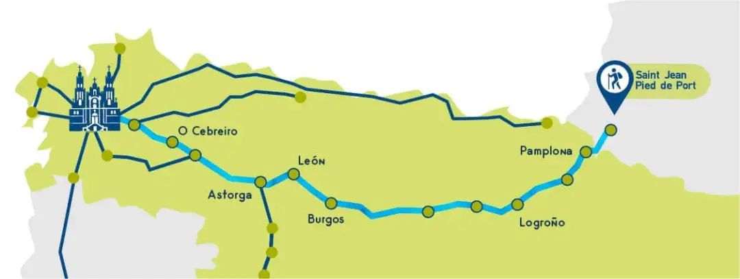 起点法国圣让-皮耶德波尔(St. Jean Pied de Port),全长约780KM,横贯西班牙北部