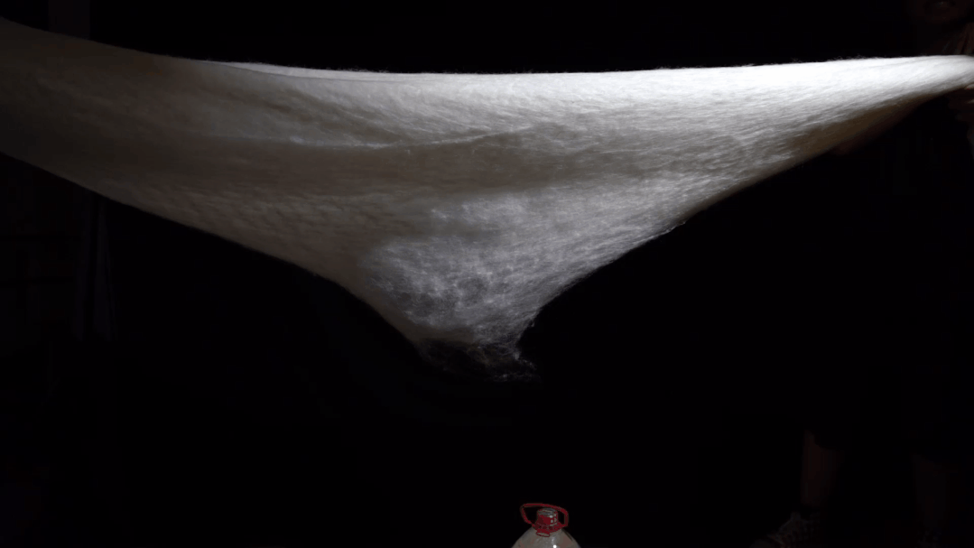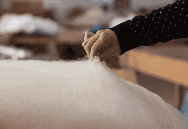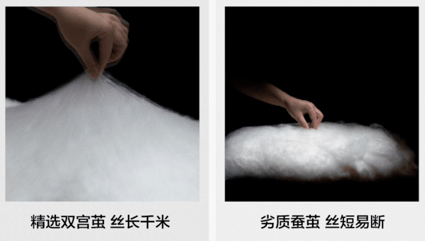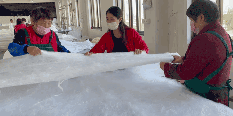 每一张蚕丝被都需要4位经验丰富的蚕娘手工拉丝,一点一点地拉扯,才能拉出一张轻薄得接近透明的棉胎!