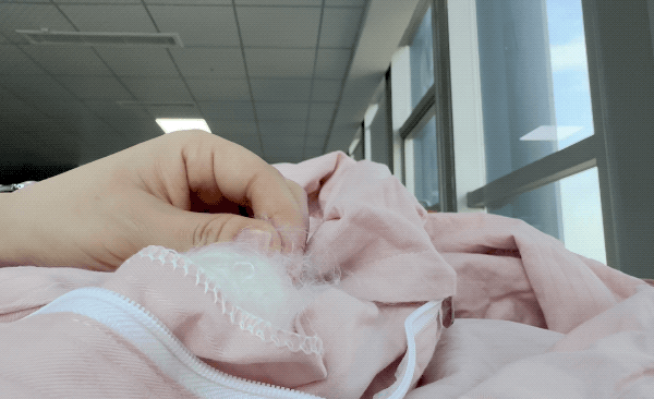 拉开被子拉链,捏起一些蚕丝,优质桑蚕长丝上提不易断裂,捏住一点就带起了整个被角。