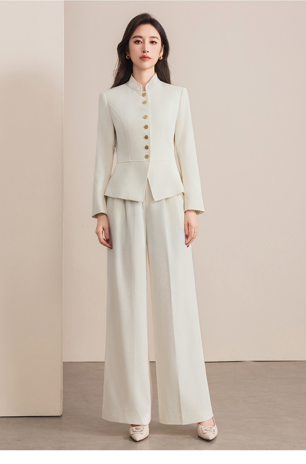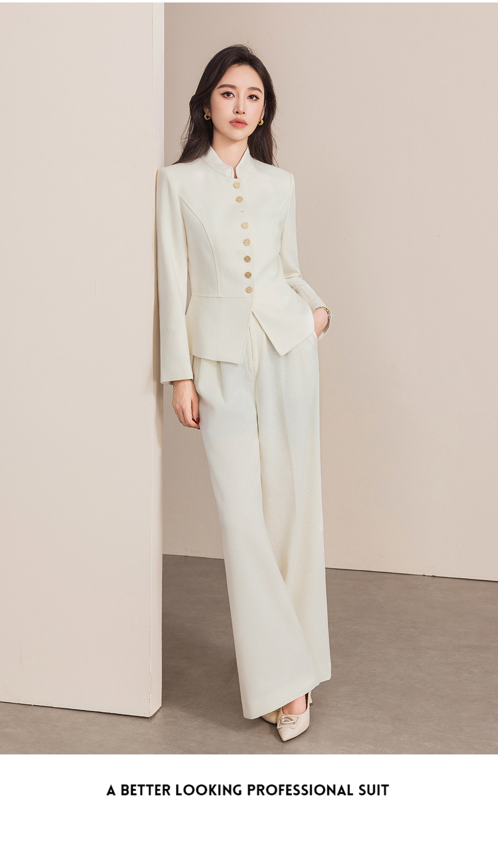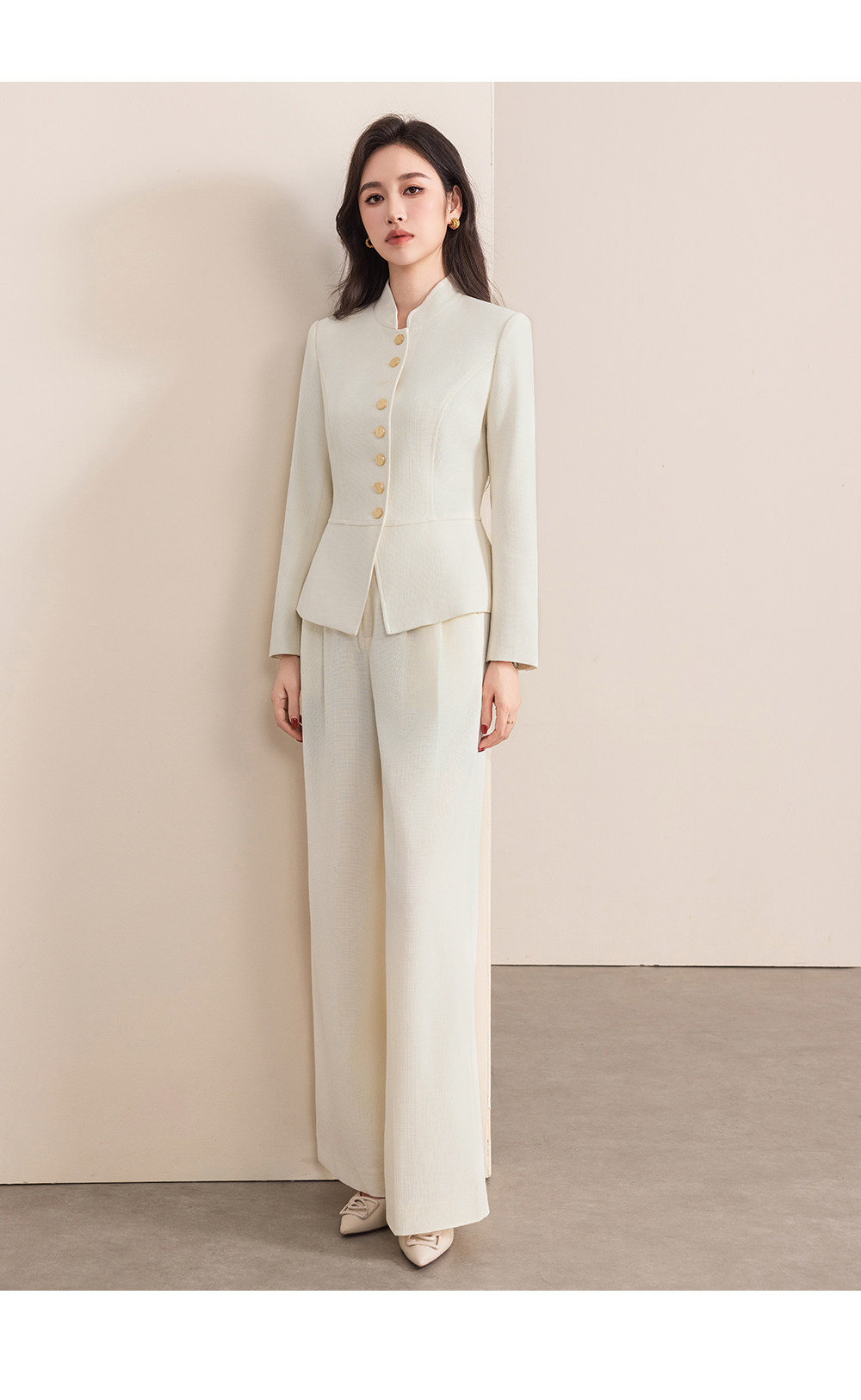 立领的设计摒弃了传统西装的拘谨,