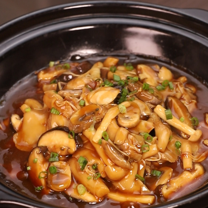 3、另起砂锅,放入菌菇和两袋熬制鲍汁,半碗水,盖盖焖8分钟;最后撒上葱花即可。