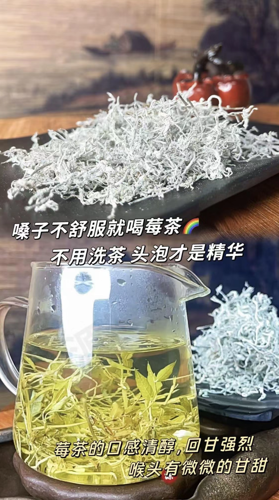莓茶的黄酮含量远高其他茶类,不含茶碱、咖啡因,是可以喝的隔夜茶,护咽利嗓。