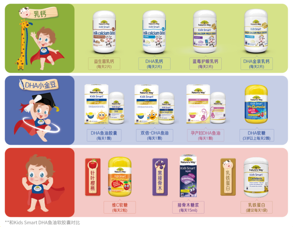 研发了专属孩子的鱼油DHA系列、乳钙系列、