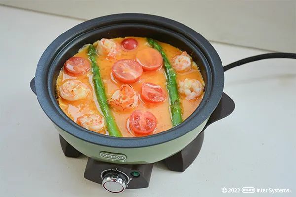 ③ 融化后倒入虾仁,芦笋,小番茄,翻炒几下。