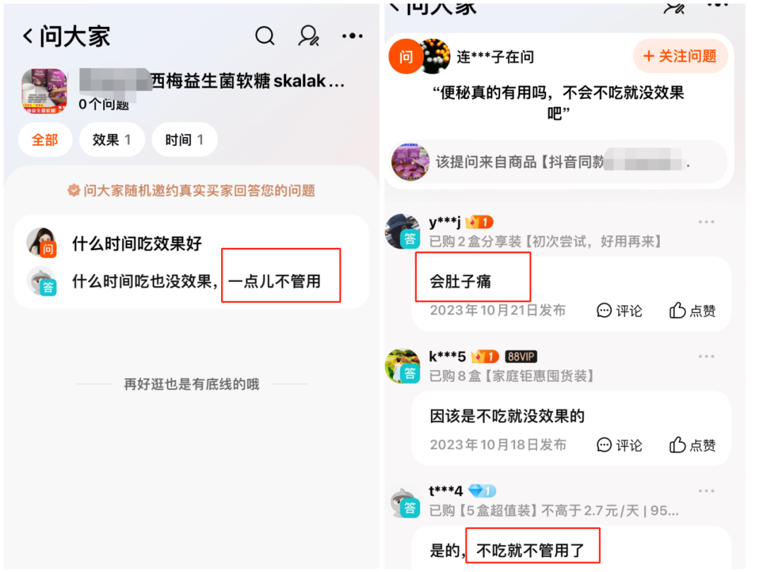 在选择它之前,我也不是没看过别的西梅软糖,某音上就有一款销量不错的,好评很多,但一刷【问大家】,都说“没用,吃了会肚子疼,一旦停了就不管用了。”