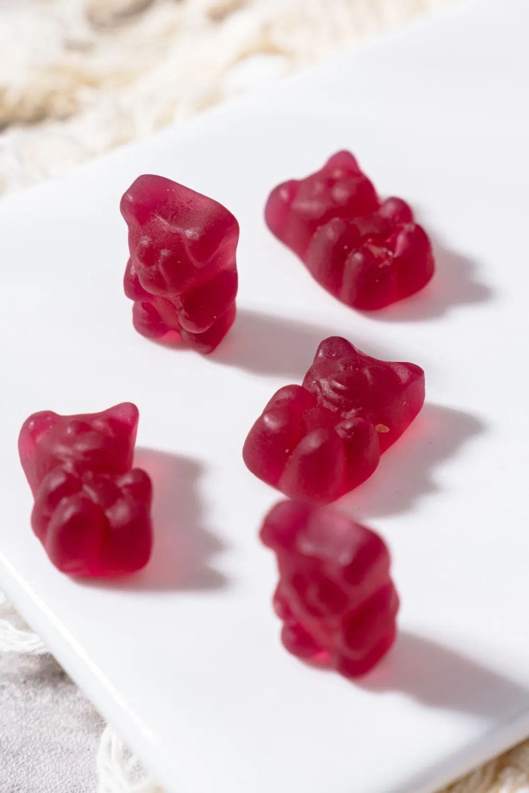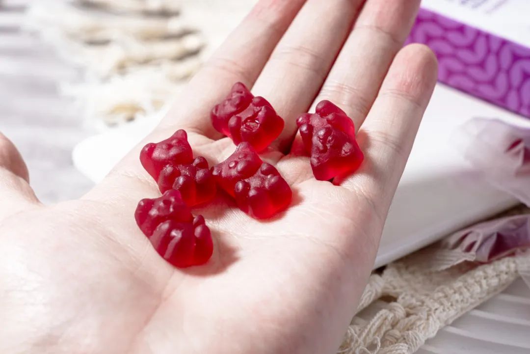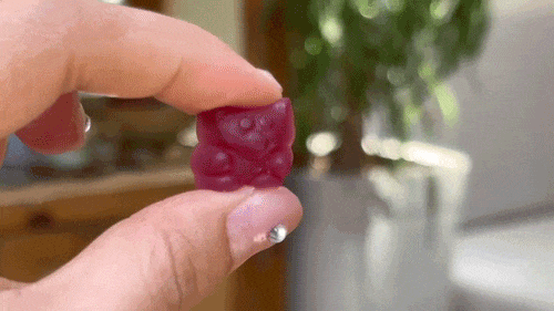 小小一盒,打开包装倒出来,里面是一颗颗紫色的小熊形状软糖。