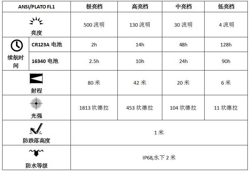 射程也能反映照明远近,但看这个参数时一定注意,是否是ANSI标准(美国标准协会ANSI:手电射出的光衰减到满月月光亮度时的距离,射程=√(光强×4))