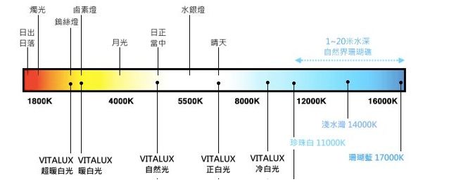 色温图谱——光色指不同温度的光发出的不同颜色,以K来表示,即将一标准黑体加热,虽温度升高而呈现的不同色彩 。