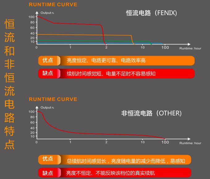 恒流电路和非恒流电路——恒流电路光线始终如一,光亮恒定,更为先进,技术含高,主流大厂很多都采用此设计;非恒流电路亮度随电量减少而降低,可以直观感受到电量的降低。