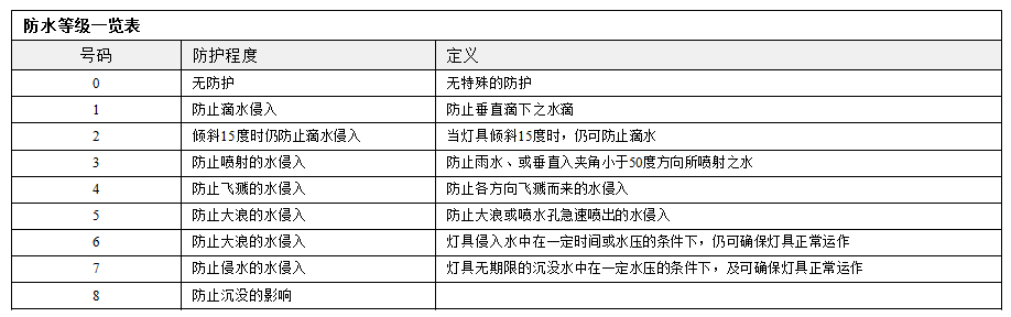 防跌落高度——灯具产品上会用米数来标明跌落等级,表示物体六个面分别自由落体到混凝土表面后不坏,不漏水(如果零件散开必须要不借助工具能装上)。