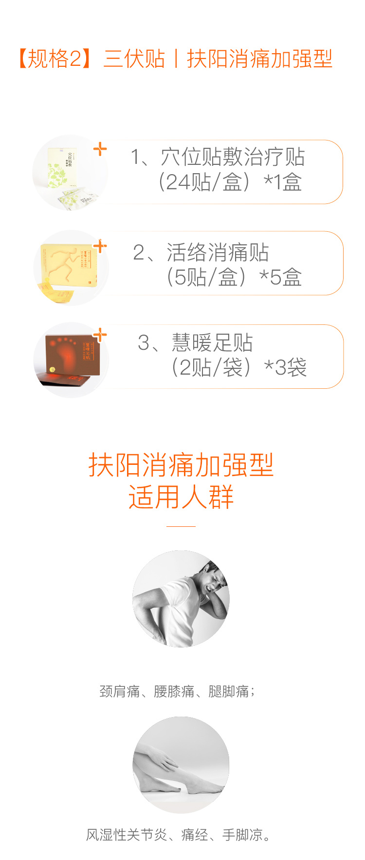 选择扶阳消痛套装的朋友,按照说明书中疼痛类的穴位贴敷,4-6小时揭下;头伏的第二天、第三天可以在相同的穴位,贴上活络消痛贴;