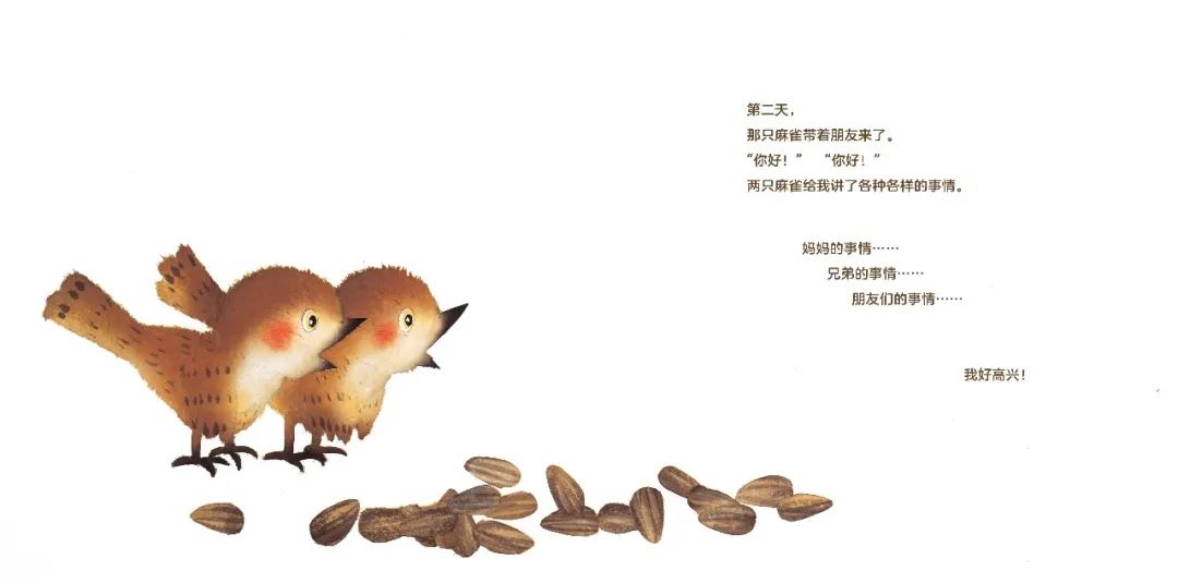 第二天,麻雀竟然带着朋友又来了,还把亲朋好友的故事讲给我听,哄得“我”好高兴……