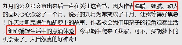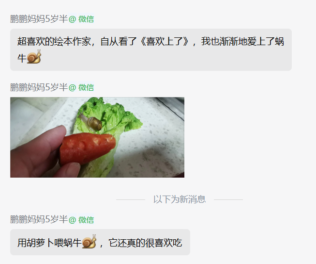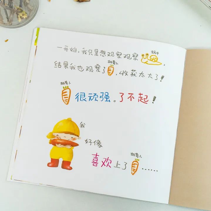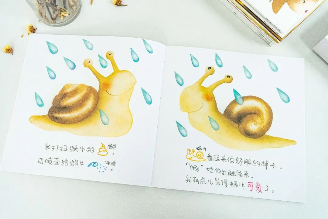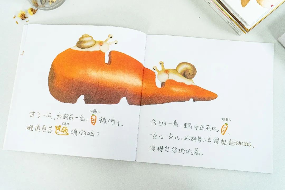 看完这篇日记形式的小故事,不止是小朋友,连妈妈都爱上了蜗牛!甚至养了一只,并喂它吃了胡萝卜……