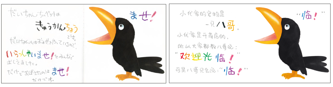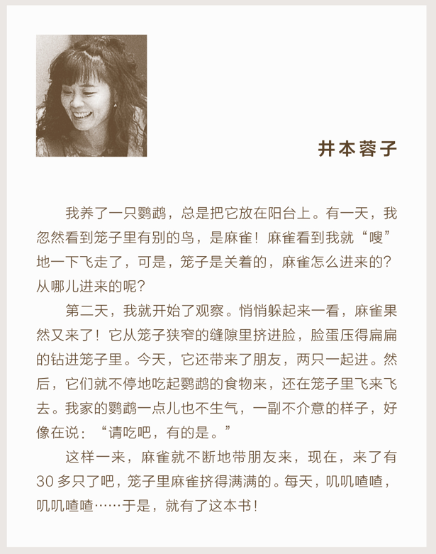 来看看《怎么办好呀》这一册,书后附带了井本蓉子的创作灵感:是根据自己养的鹦鹉被麻雀抢食的遭遇,才有了这个故事。