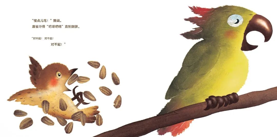 故事以第一人称展开,“我”是一只鹦鹉。“我”一假装睡觉,麻雀就钻进笼子偷吃“我”的东西。但“我”并没有生气,反而让它慢慢吃。