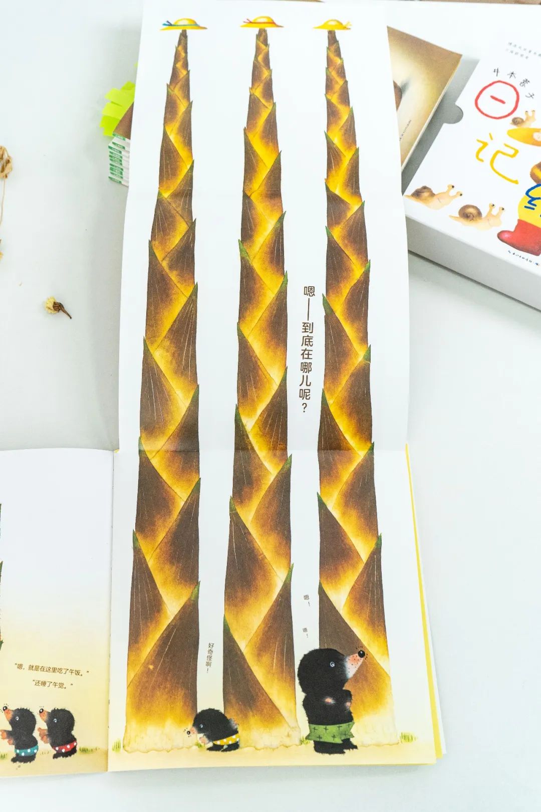 比如这一页,想体现竹笋能长得很高,所以运用了超长折页。翻开,再翻开,桌面都快放不下啦!