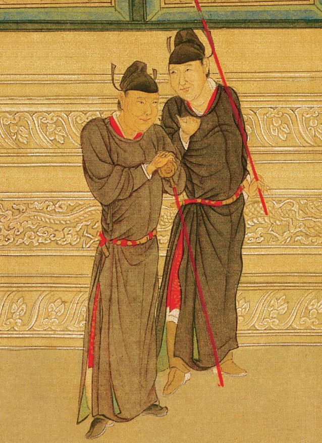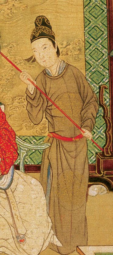 明代男子的服装以袍衫为尚,公服在洪武二十六年定,衣用盘领右衽袍,袖宽三尺。盘领即圆领,《汉宫春晓图》中的侍者,男官服装皆与之相符。