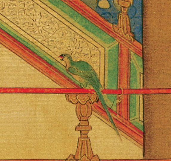 画面中鸟类共出现四种,有孔雀,鹦鹉,以及似是锦鸡和鹭鸶(或白鹇)的两种。一共六只。