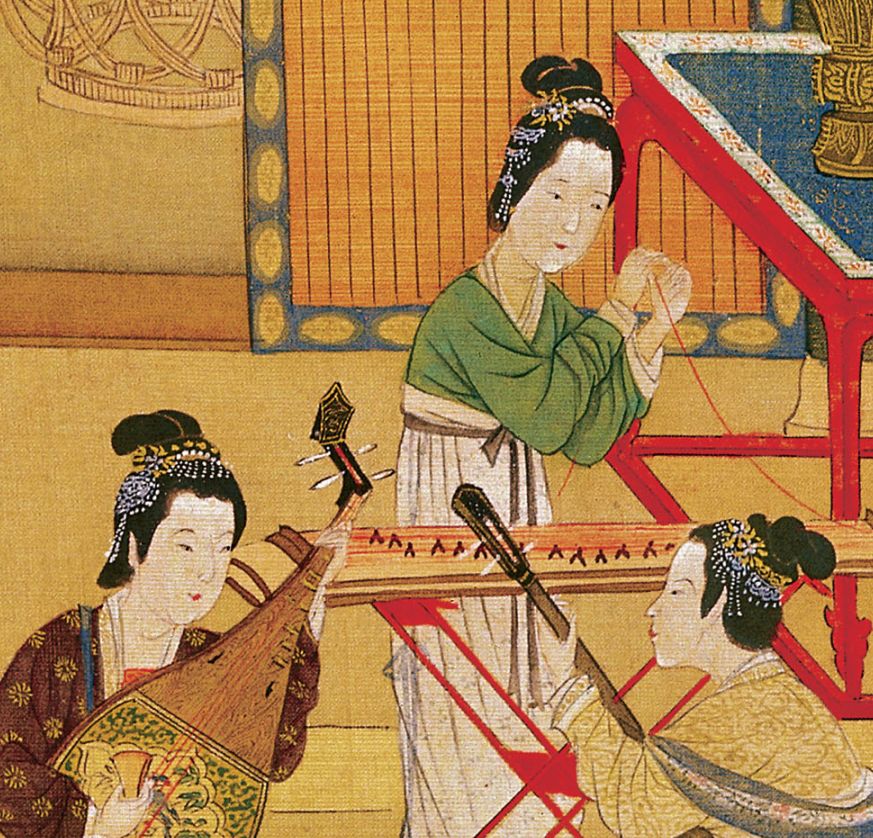 再看人物面部,仕女均采用三白法画面色,以白粉提额,鼻以及下颏,并施朱唇,闲适的神色与绫罗绸缎和珠光宝气配合,粗细灵活,兼用高古游丝描和琴弦描。优渥的生活条件和画题的春意自然呈现。
