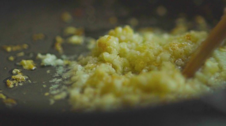 3、热锅凉油,油热后关火,蒜蓉入锅,待其微微变黄时,重新开火,添一小捏白糖,3勺蒸鱼豉,2勺水;