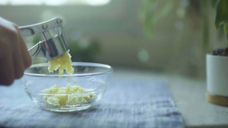 2、把大蒜去皮,压成蒜泥;