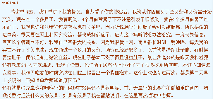 还有就是调理鼻炎和咽喉炎的时候现在效果还不是很明显,前几天鼻炎的比赛有稍微加重的意向,咽喉炎暂时还没什么大的效果。如果有效果了我在留贴说明,在这里再次感谢单老师。