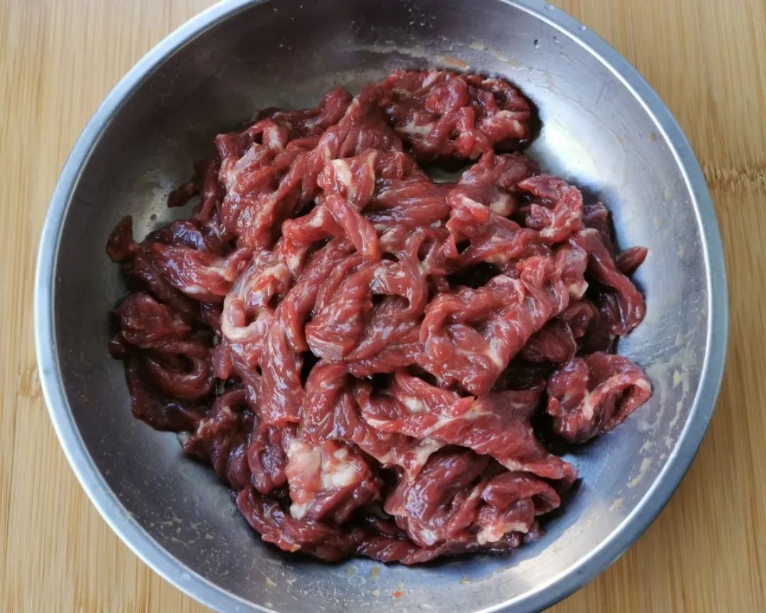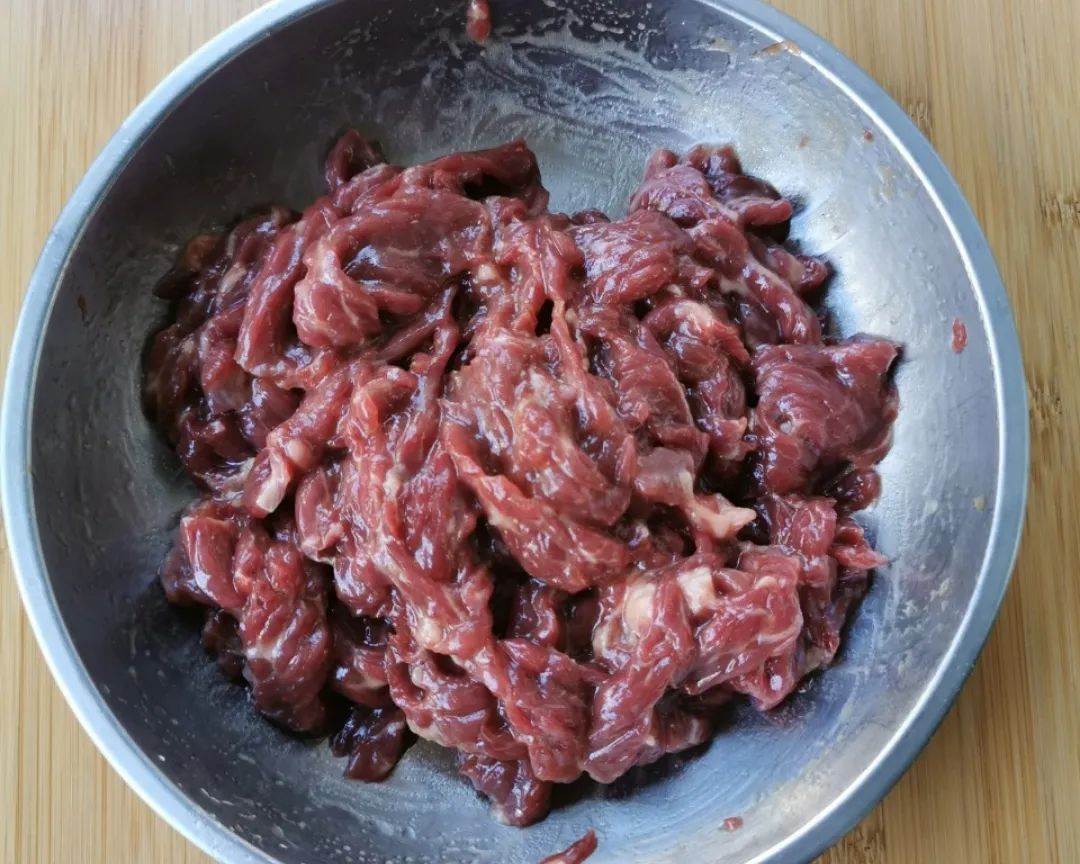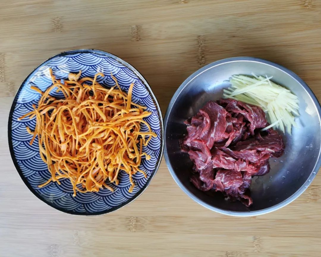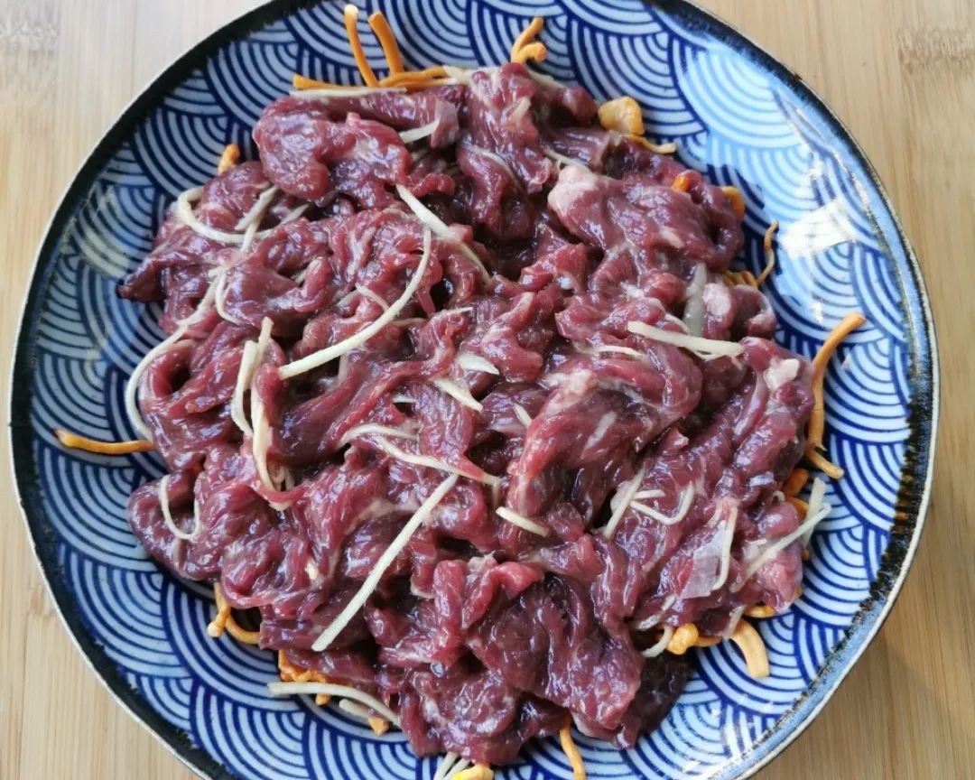 1 | 虫草花洗净沥干,牛肉逆纹切成薄片(牛肉一定要逆着纹路切,即刀与纹路呈90°,将纹路切断);生姜去皮切成细丝,葱切成葱花。