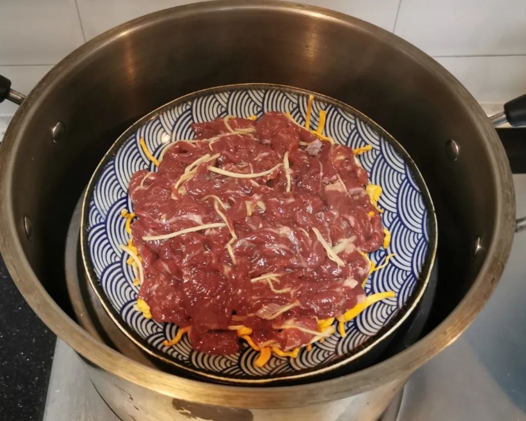 4 | 蒸锅内放水先烧开,再放入牛肉盖上盖子,大火蒸8~10分钟。蒸好后再撒上葱花即可出锅!