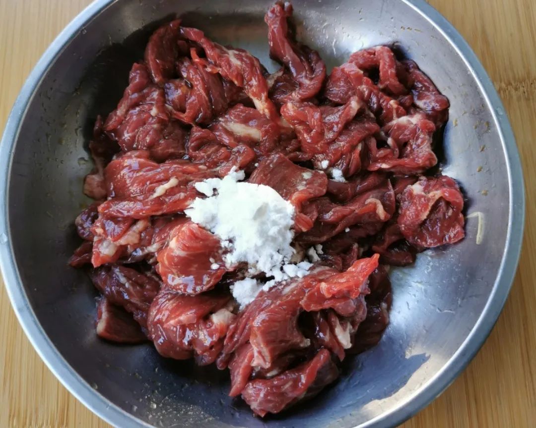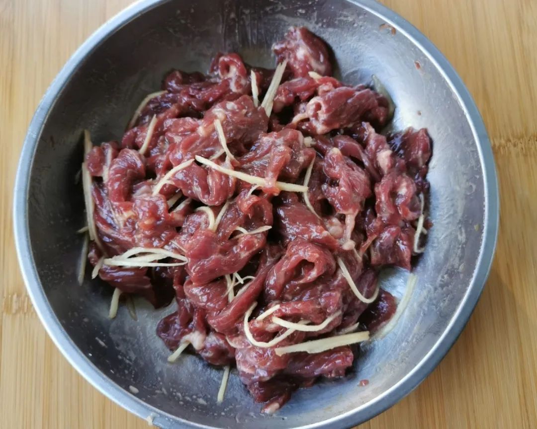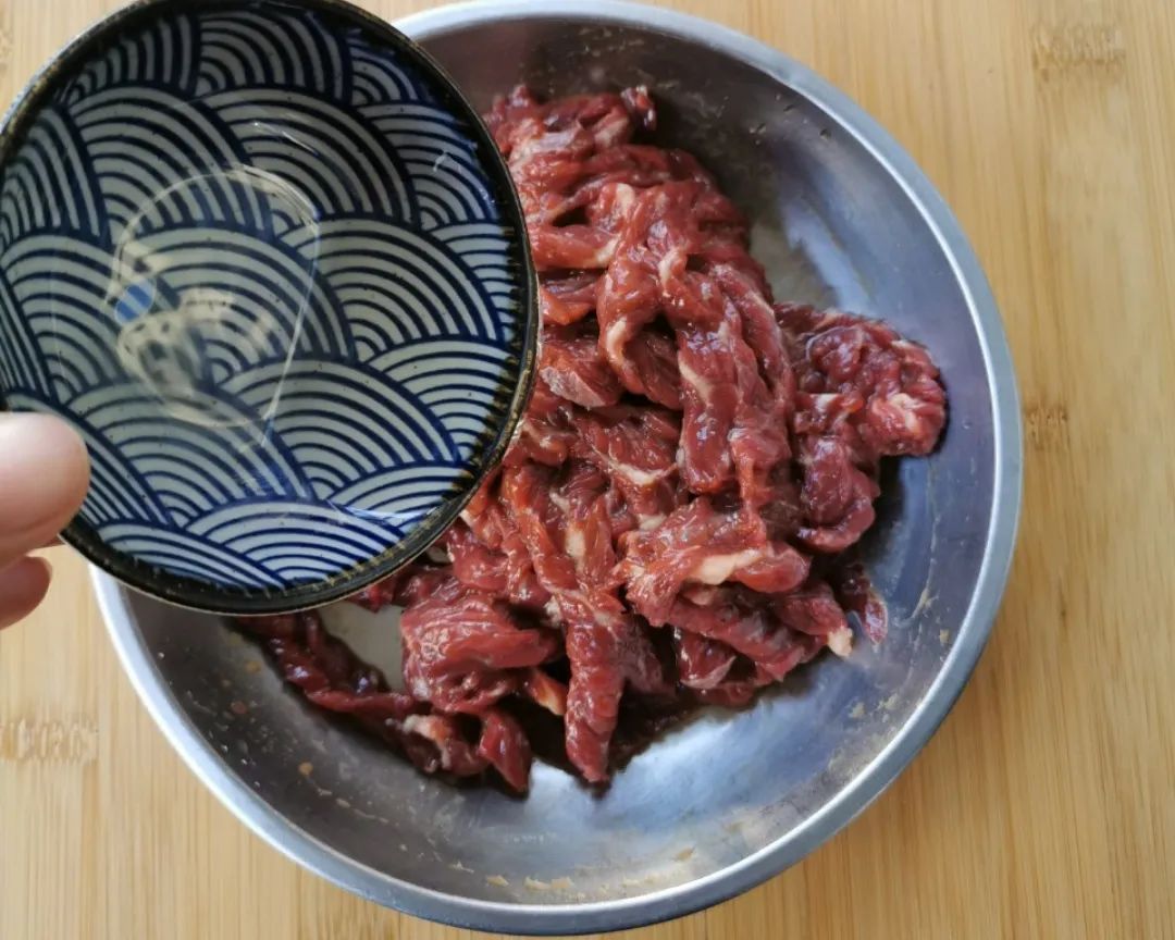 2 | 将蚝油、生抽、白糖、胡椒粉、生粉、鸡蛋清、料酒、盐放入牛肉中,用手反复抓匀,再放入油;继续反复抓匀至油被牛肉吸收,再放入姜丝,抓匀。