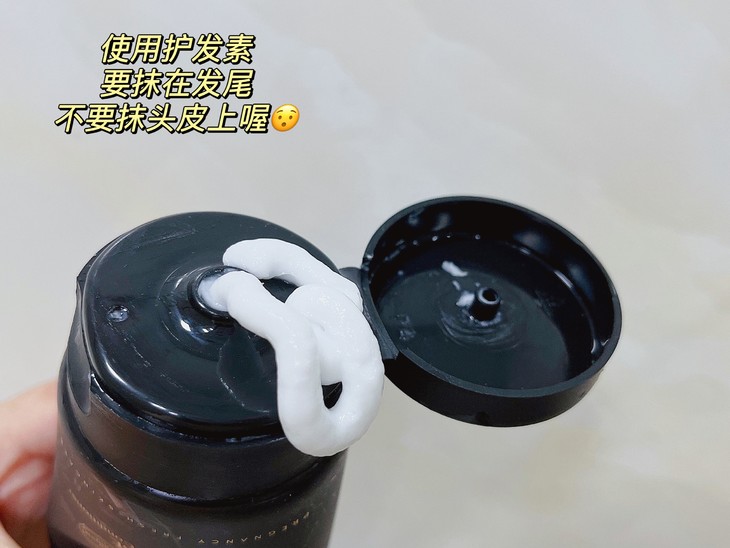 2️⃣.从耳朵以下部位开始涂抹护发素,重点涂抹发尾这些易分叉打结的部分,尽量不要让护发素接触头皮