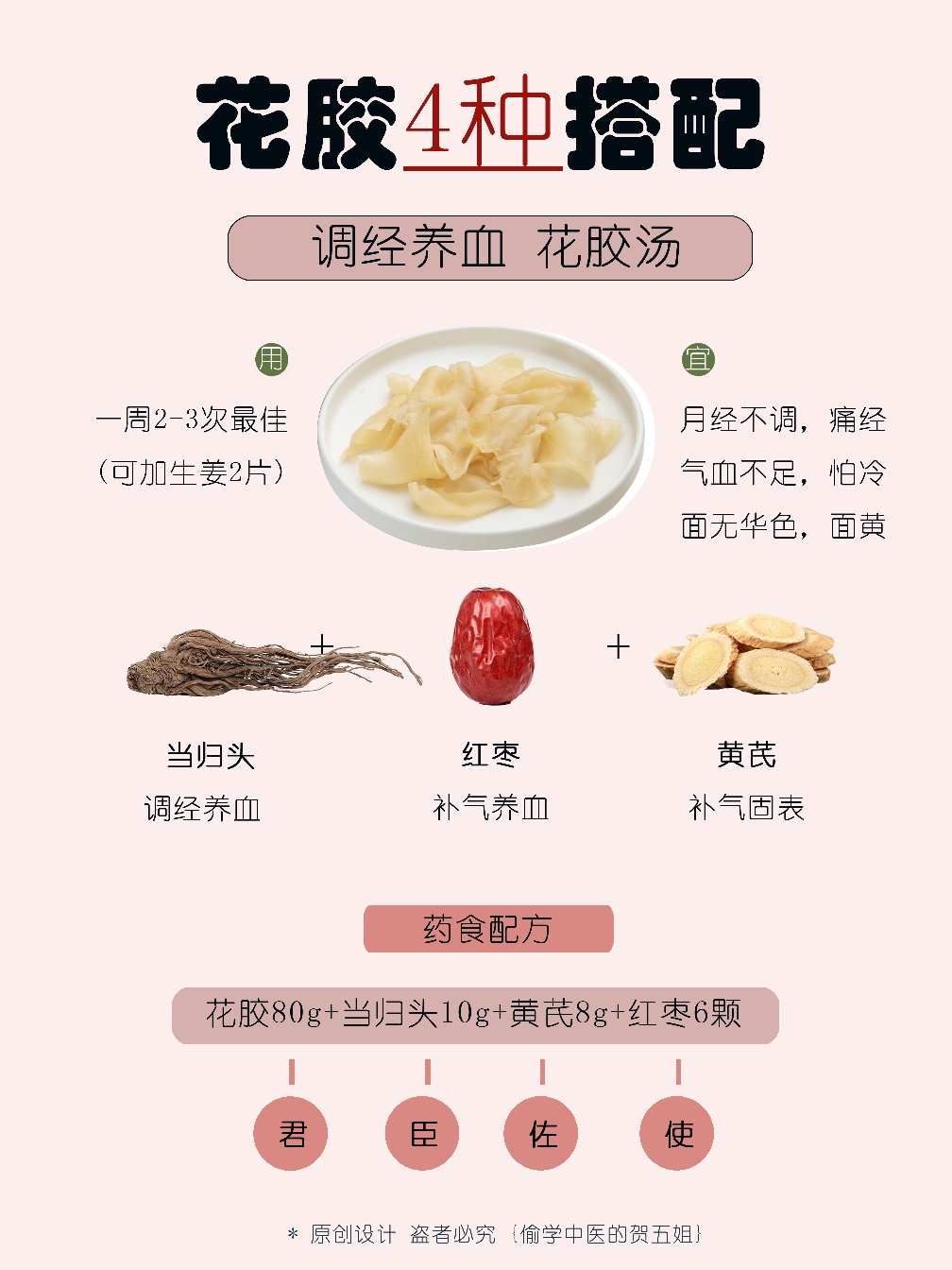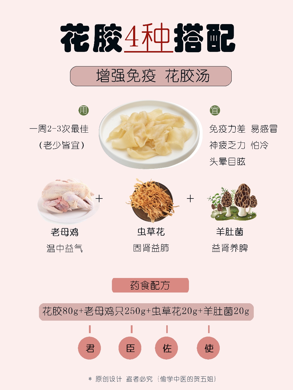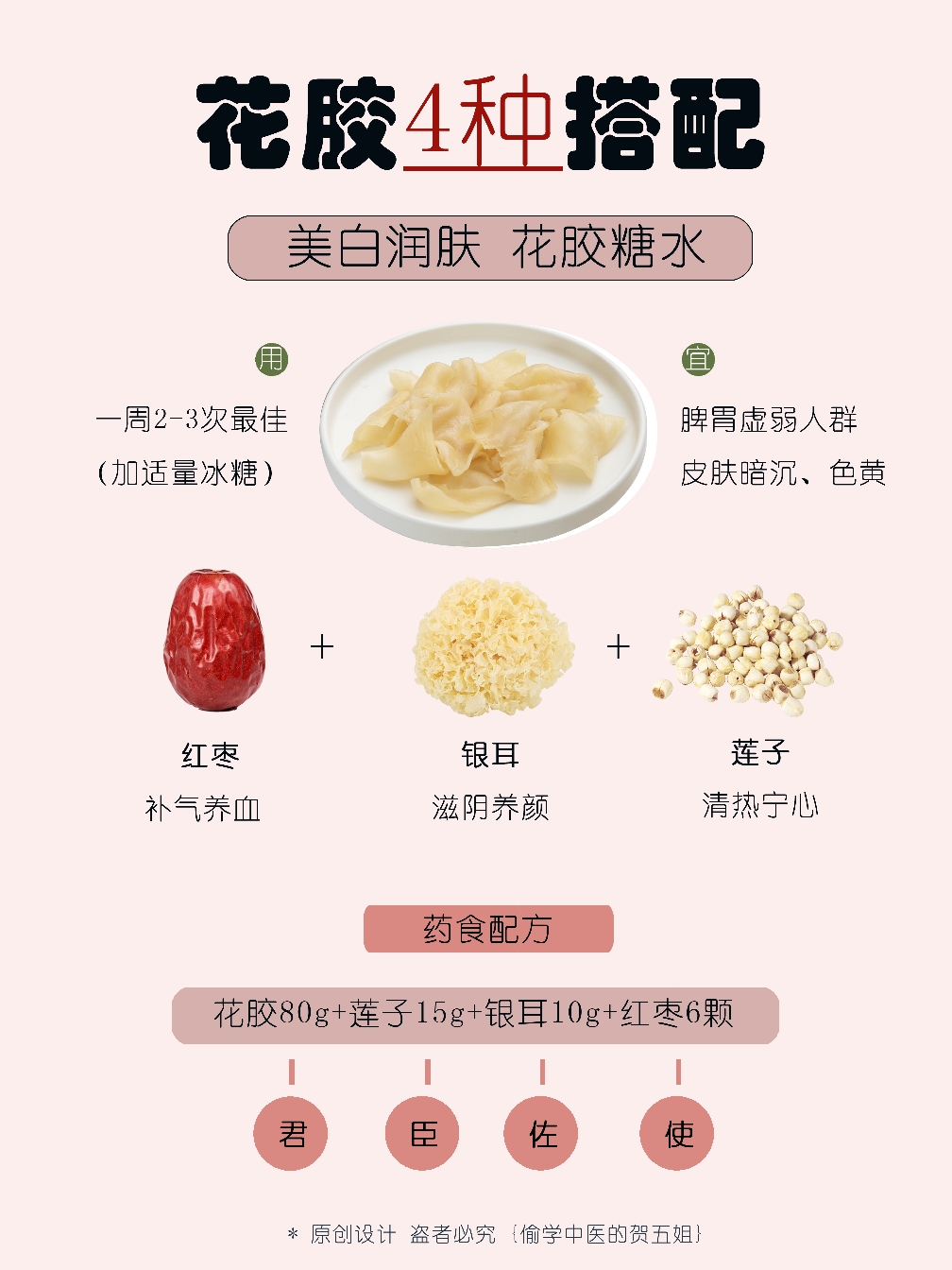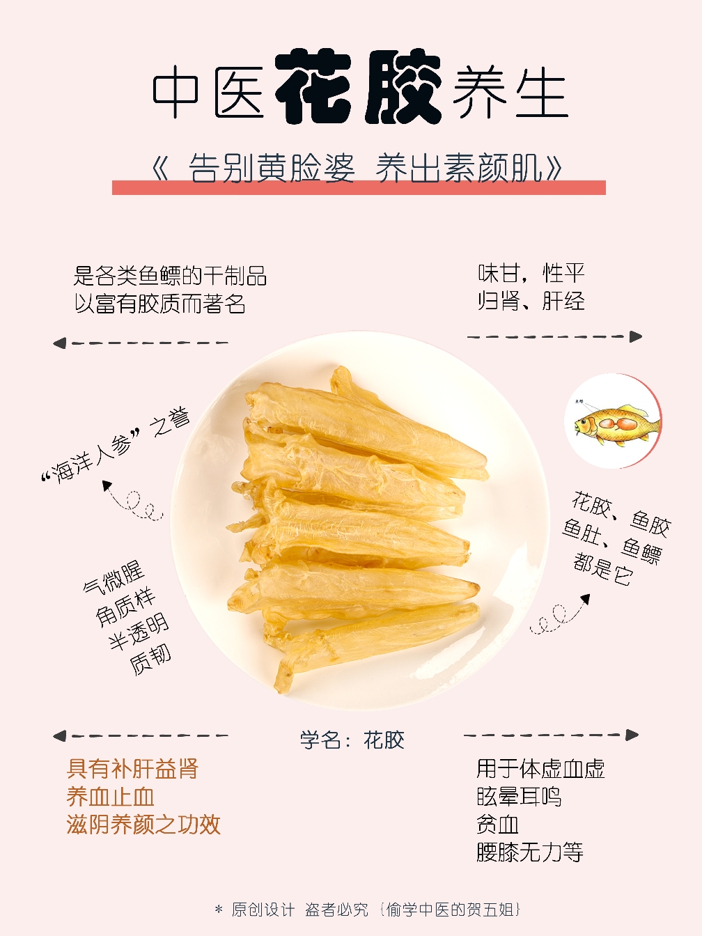 由于花胶性味平和,可以和多种失误进行搭配,因此@偷学中医的贺五姐 在这里总结了几味花胶的食疗经典养生方