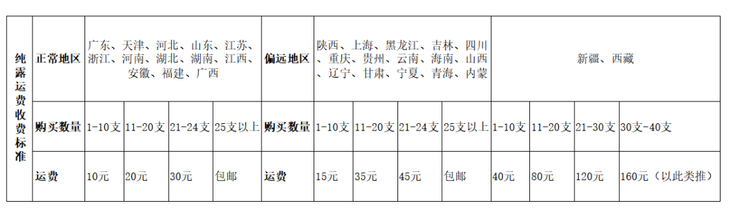 考虑到纯露的重量大、包装复杂、运输成本高,今年纯露单人购买25支以上将会包邮,25支以下根据每个人的购买数量将会收取一定运费,具体运费请依照下表: