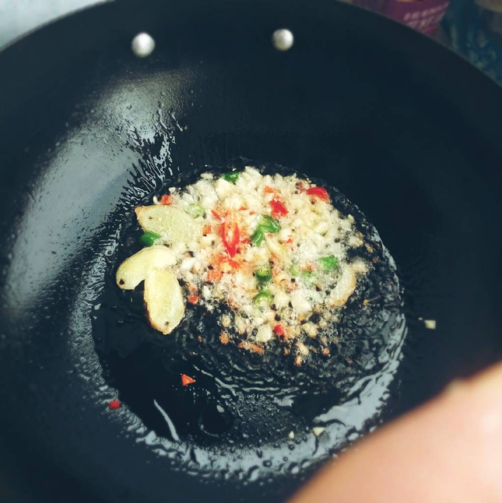 1、热锅凉油,放入一半量的葱、姜、蒜、辣椒碎爆香;