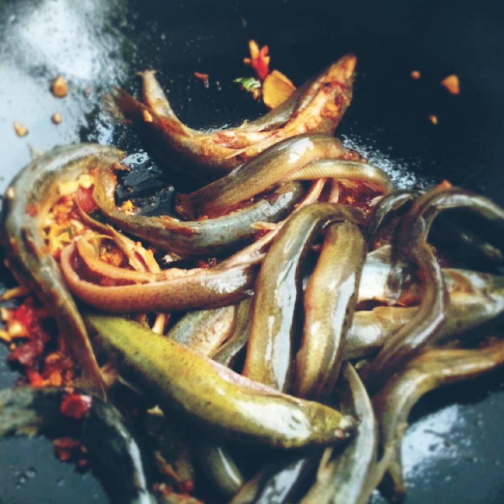 3、炒香后,放入泥鳅爆炒至两面焦黄,放入所有的葱、姜、蒜、辣椒碎翻炒;