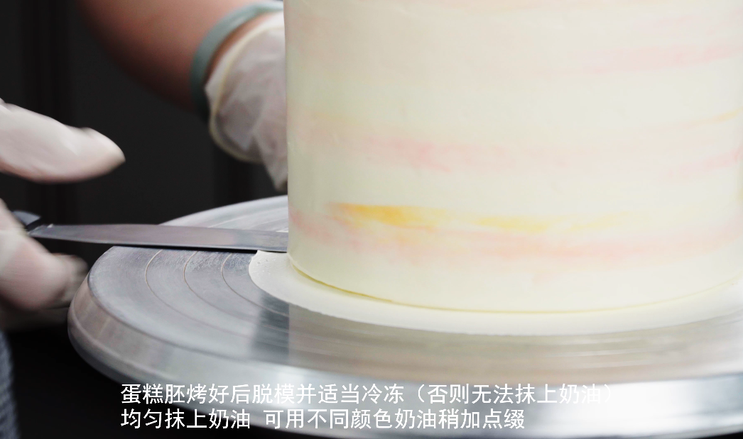 第五步:蛋糕胚烤好后脱模并适当冷冻(否则无法抹上奶油),将蛋糕胚顶部削平,抹上夹心奶油,再将蛋糕外壁均匀抹上奶油,可用不同颜色奶油稍加点缀。