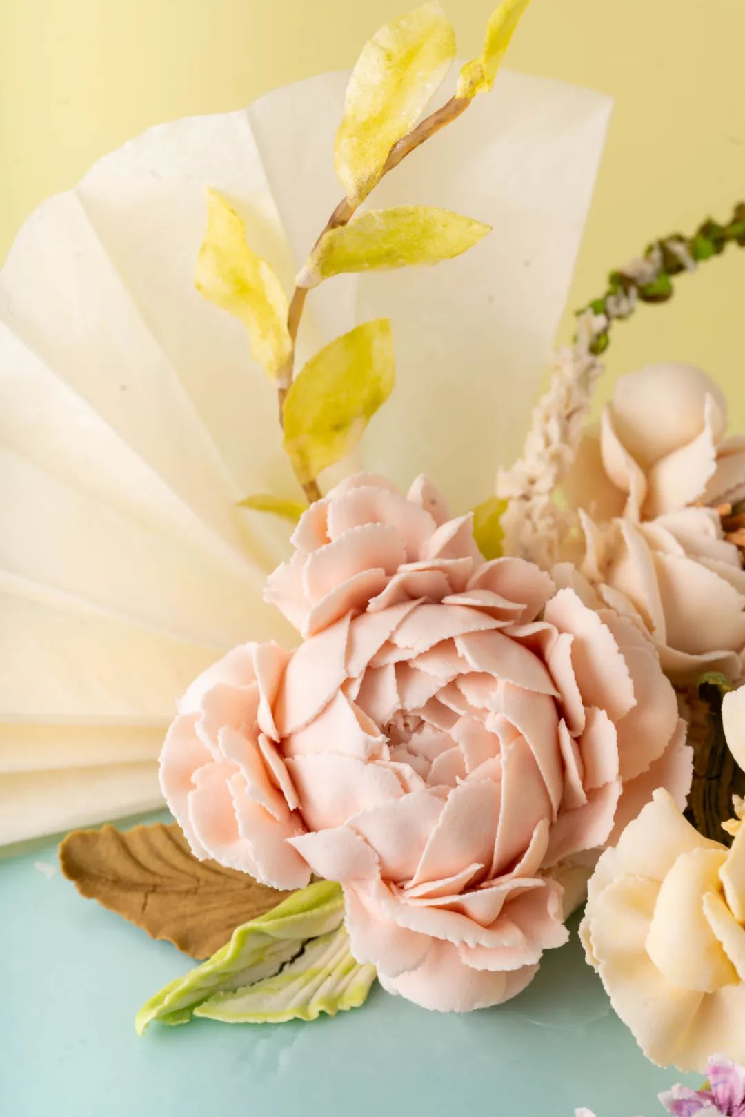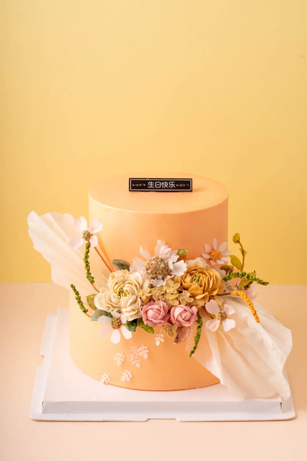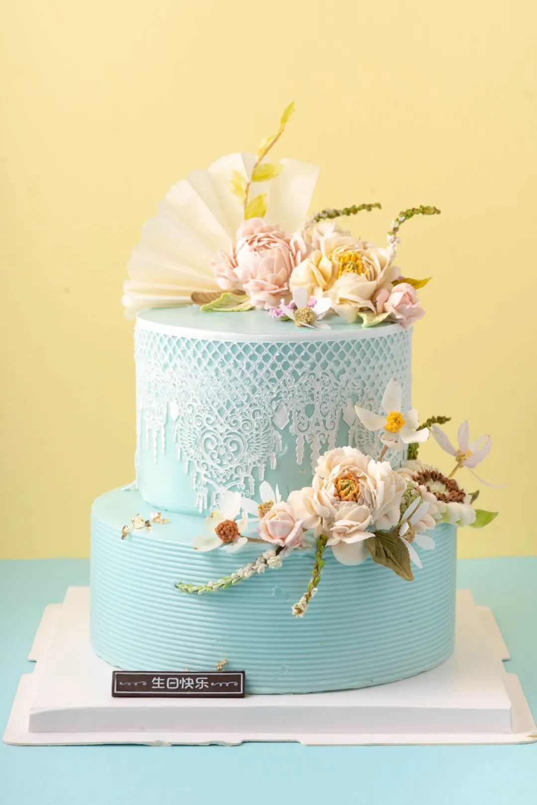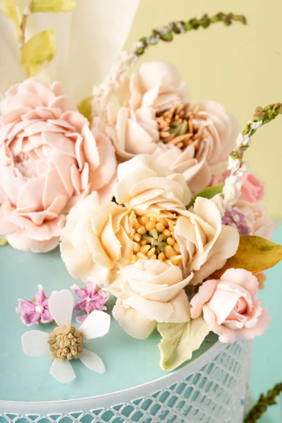 第六步:使用花朵模具制作出你喜欢的装饰物,适当装饰在蛋糕上,这样韩式裱花蛋糕便新鲜出炉啦!