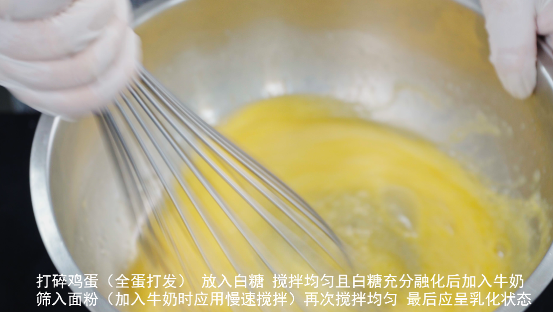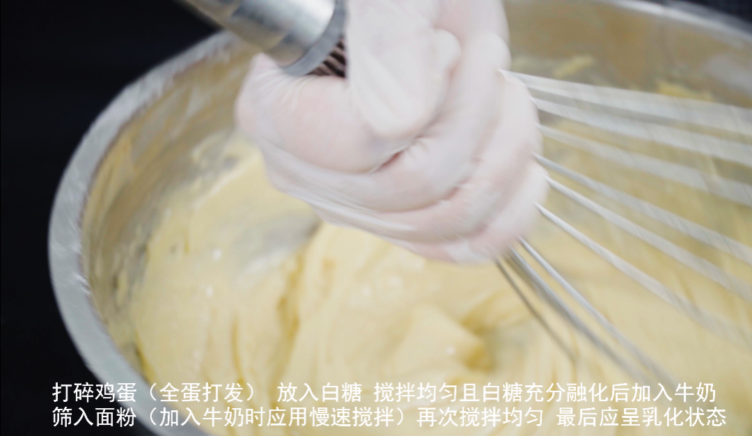 第一步:打发鸡蛋(全蛋打发) 放入白糖,搅拌均匀且白糖充分融化后加入牛奶。