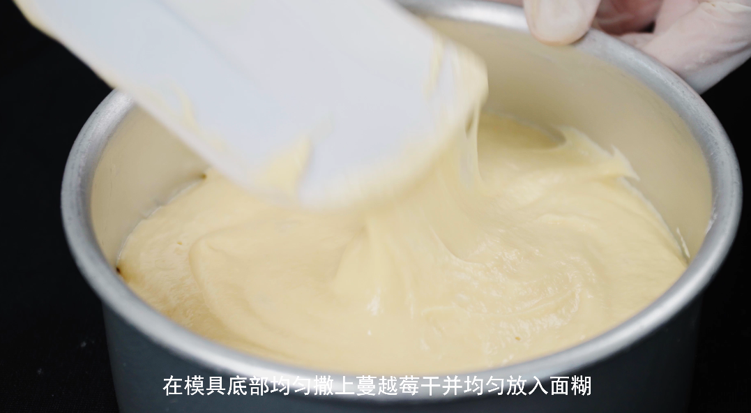 第三步:在模具底部均匀撒上蔓越莓干并均匀放入搅拌好的面糊。