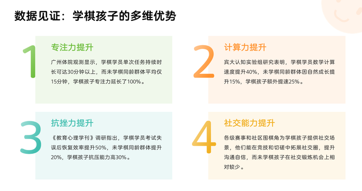 专注力、计算力、抗挫力、社交能力,这些重要又难以锻炼的能力,有了围棋的爱好就能轻松提升了~