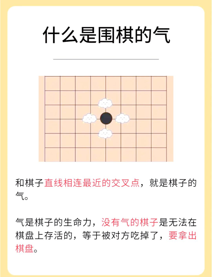 但是在豌豆围棋中,“气”的知识,会先介绍:“棋子的气就像人一样,需要呼吸,不能被堵住”