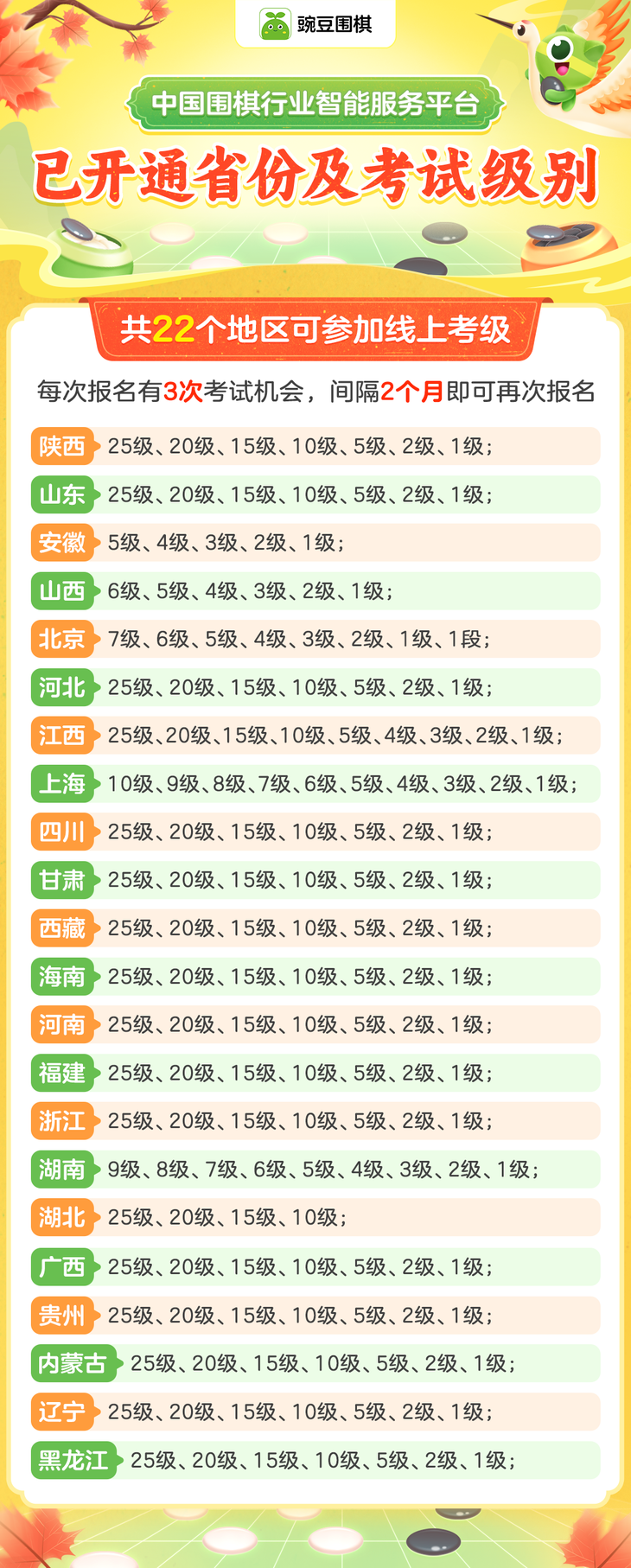 根据豌豆围棋的调研,目前已经有22个地区可以参加线上考级,每次报名有3次考试机会
