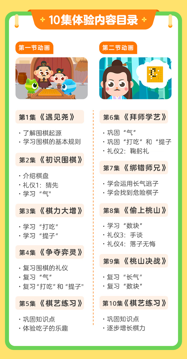 每一节围棋课程,都是以经典历史文化故事为背景,在孟母三迁、囊萤夜读的典故中学习围棋知识,跟着围棋的创始人尧、擅长围棋的春秋名人秋等历史名人一起学习围棋知识