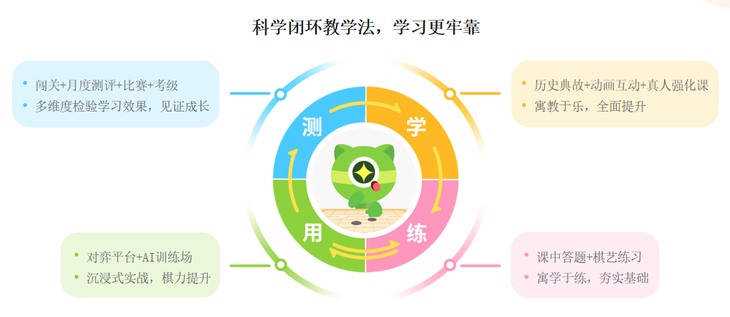 豌豆围棋如此好的学习效果,和好的教学方法也有关系,豌豆围棋采用学练用测闭环式教学法,孩子更容易吸收、掌握好围棋知识