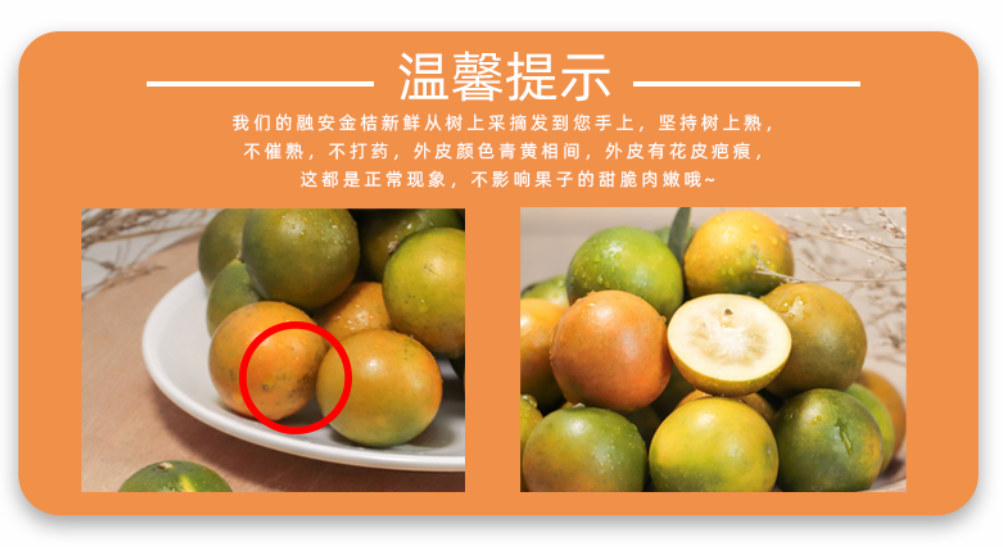 果农们取清澈的山泉水灌溉,坚持不催熟,不提前采摘。表皮还有点青是融安金桔的特色,此时已经是一颗成熟的金桔。大自然最清甜的馈赠,永远值得等待。