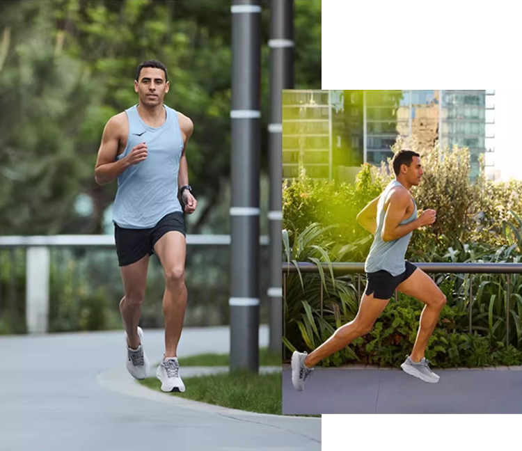 跑起来的时候,能减少步态对身体造成的冲击,将身体重心向前移动,保护双脚,降低体力消耗。