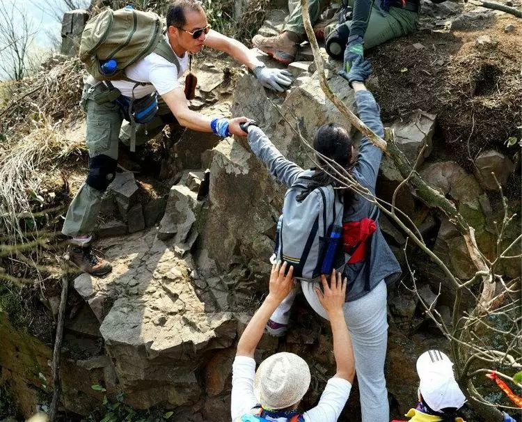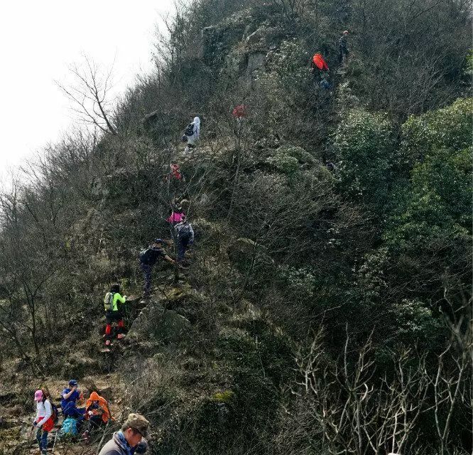对许多成员来说,攀登第一座山,轻而易举。然而,正式的挑战在午饭后才开始,翻过了一个山头后,像是突然进入了另一个世界,奇石林立、怪石嶙峋。慢慢地,登山队伍也逐渐开始分了档次,有的一马当先,走在了前面,有的在后面慢慢地走着、聊着。