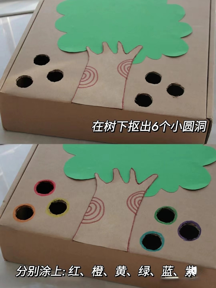 制作完成,我们可以引导宝宝摘下毛绒球,投进相应颜色的洞中,以锻炼宝宝的精细动作,手眼协调和颜色认知的能力。