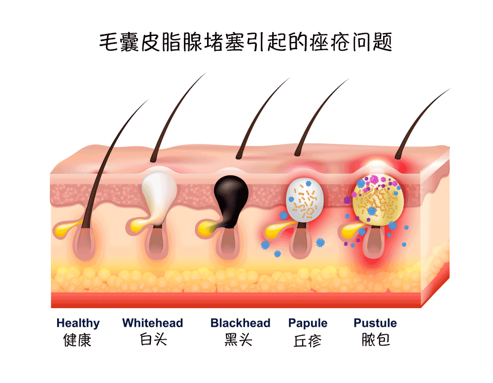 皮脂腺分泌过多和清洁不彻底导致的毛孔阻塞,会让肌肤新陈代谢不畅,从而引发痤疮问题,即我们俗称的黑头、痘痘等。