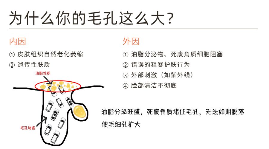 ✅ 油脂分泌旺盛和死废细胞脱落堵塞毛孔,过剩的皮脂堆积在毛孔中,令毛孔逐渐膨胀,是毛孔粗大最常见的原因